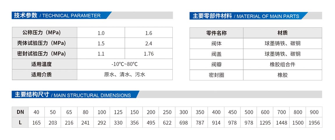 采用全流面積式設計,水頭損失小,不易堆積雜物,密封采用斜板式設計,關(guān)閉行程短,閥瓣采用橡膠與鋼板經(jīng)高溫壓制而成,耐沖涮,密封性能好,產(chǎn)品結(jié)構(gòu)簡單、維護和保養(yǎng)方便。